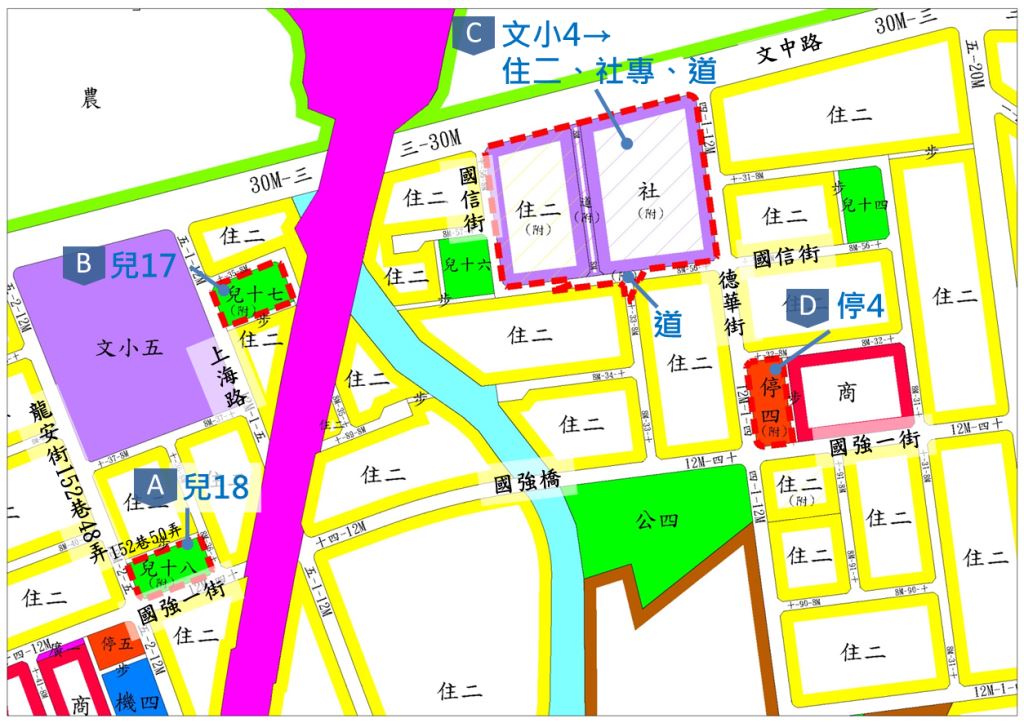 (四) D區:東側以人行步道用地為界,西側以德華街為界,南側以國強一街為界,北側以8米計畫道路為界。