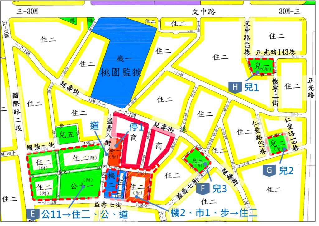 (五) E區:東側以人行步道用地及第二種住宅區為界,西側以國際路二段為界,南側以益壽七街為界,北側以國強一街及商業區為界。